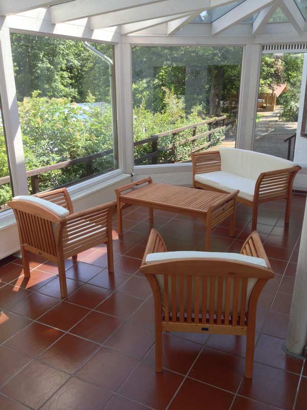 Das großzügig ausgebaute Obergeschoss des Hauses mit weiten Panoramafenstern auf Höhe der Baumwipfel lädt ein zum entspannten Gespräch in kleiner Runde, zur gemütlichen Spiel- oder Lesestunde, aber auch zum Fernsehabend vor dem Großbild-Monitor (Satelliten-TV).