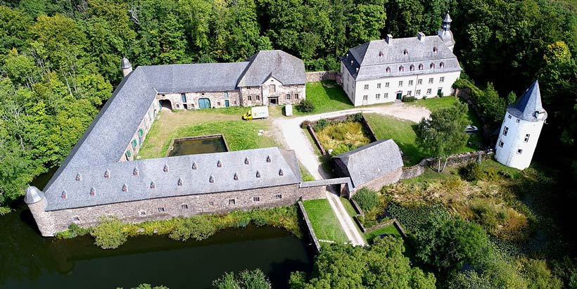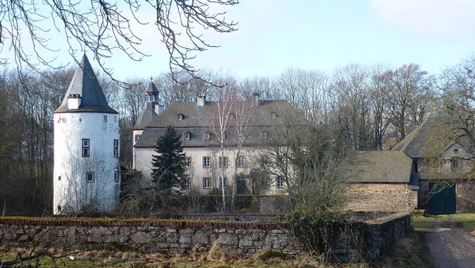 nahe am Nationalpark Eifel, ist die höchstgelegene Wasserburg im Rheinland (540 Meter über Normal-Null). Sie wurde um das Jahr 1300 aus Bruchstein errichtet und später teilweise verputzt. Erweitert wurde sie zwischen 1680 und 1695 um ein zweigeschossiges Wohnhaus und den Südflügel. Mit ihren breiten Wassergräben und den beeindruckenden Burgwällen ist die Burganlage ein gutes Beispiel für die Bauweise einer rheinischen Wasserburg.
