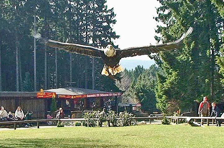 Bei den regelmäßigen Flugvorführungen werden Adler, Bussarde, Milane und Falken mit waghalsigen Manövern in freiem Flug gezeigt. Den Besuchern wird geraten, besonders auf ihre kleinen Hunde aufzupassen...